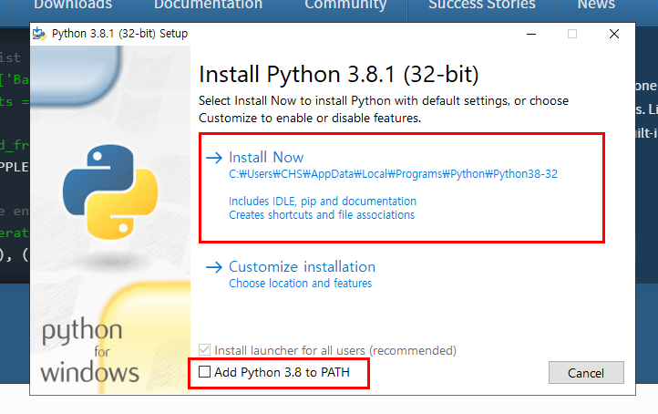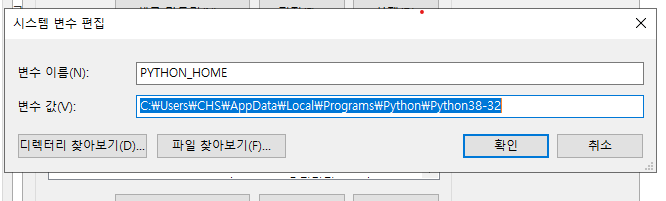 - 나의 경로는 C:\Users\CHS\AppData\Local\Programs\Python\Python38-32 이다